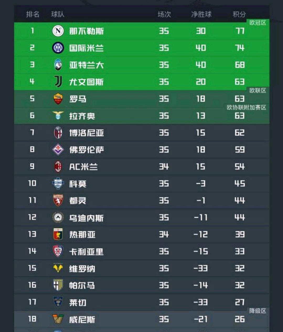 5月5日,随着意甲联赛第35轮逐渐收官,除了AC米兰对阵热那亚的比赛尚未结束外,其他九场赛事已全部结束。本轮赛程结束后,意甲欧战资格的争夺变得更加扑朔迷离。值得一提的是,目前排名前列的四支队伍积分相同,仅用一分之差,整个竞争局势变得异常激烈,悬念重重,每一场比赛都将左右最终归属,这种燃情程度甚至堪比法甲联赛的激烈角逐。