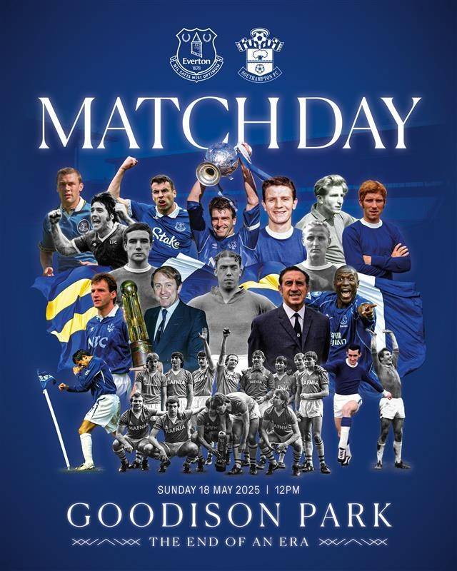 埃弗顿官方社媒晒出海报告别古迪逊公园球场,配文:“133年、2791场比赛、5370粒进球,无数珍贵的回忆。我们的男足一线队最后一个古迪逊公园比赛日。”