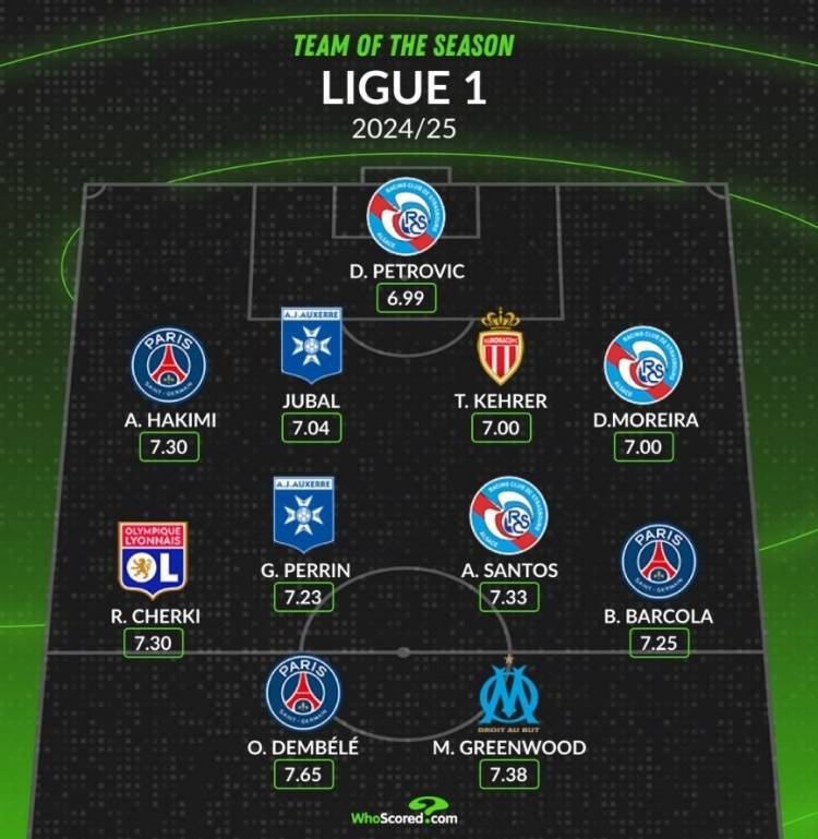 直播吧5月20日讯 本赛季法甲战罢,数据网站Whoscored也盘点了本赛季法甲场均评分最高阵容,具体如下:
