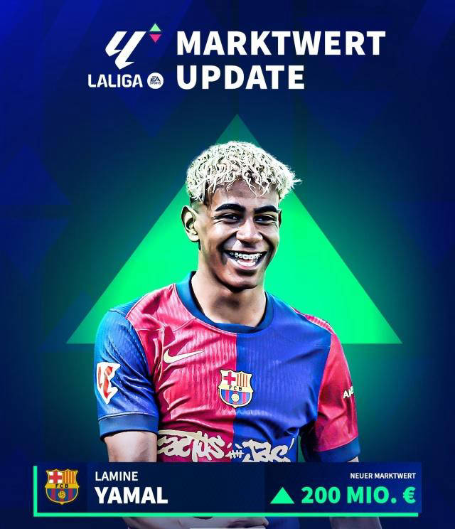 亚马尔的身价从1.8亿欧元飙升至2亿欧元,使其成为全球身价最高的球员,贝兰厄姆、姆巴佩、哈兰德以1.8亿欧元并列第二位。